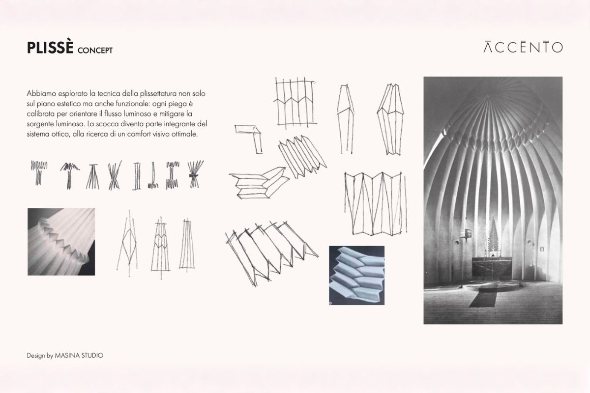 Plissè, l’ultima lampada sviluppata per Accento, è nata dalla volontà di creare una lampada dove la fonte luminosa fosse il nostro punto di partenza: una luce che c’è ma non si vede. Da subito ho pensato alla Cappella di Ronchamp di Le Corbusier, alle pieghe di un kirigami e al gioco di luci e ombre che ne scaturisce. Il risultato: una forma sospesa tra tradizione e tecnica, una luce performante e poetica.