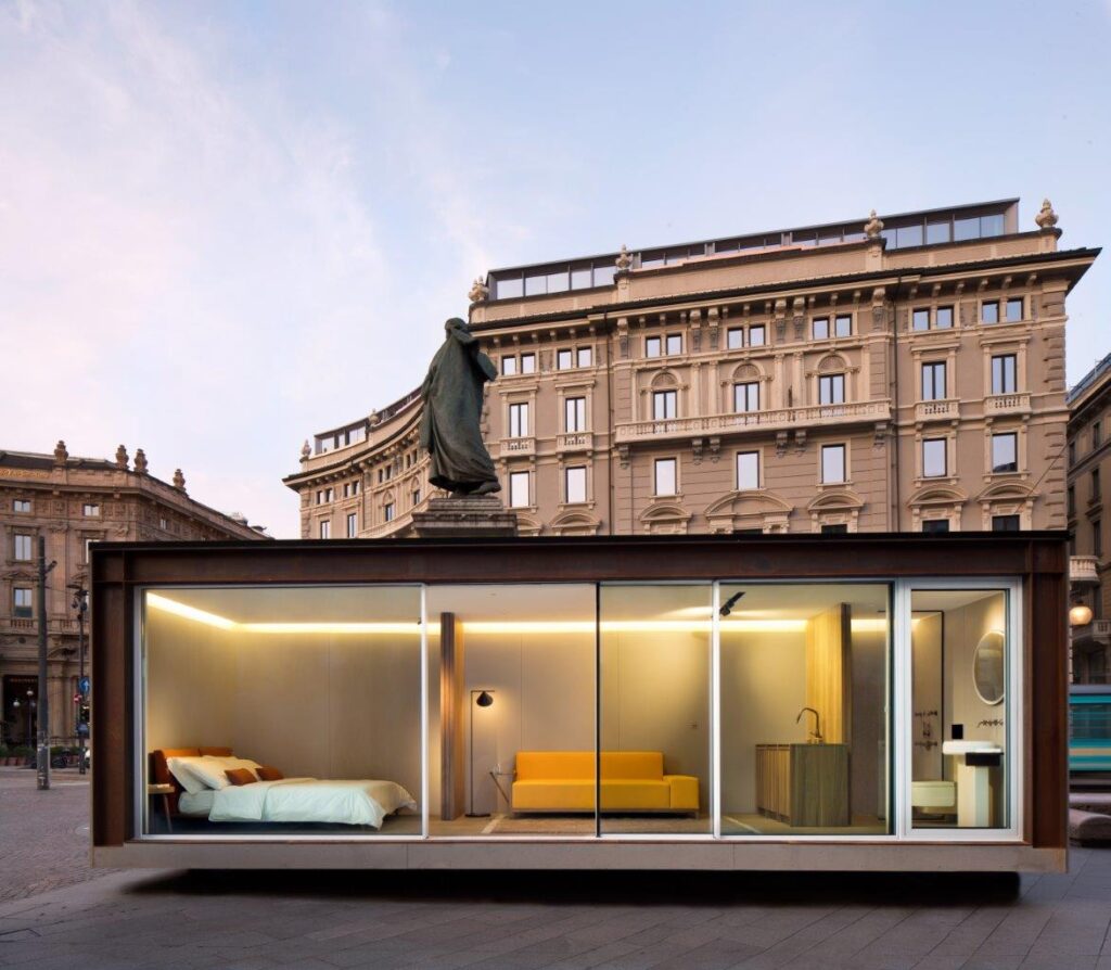 Un manifesto dell’abitare nomade. Questo modulo prefabbricato (3 x 9 metri) è stato progettato per rispondere alle più rigide esigenze di sostenibilità. Definito da una cornice in acciaio corten e una facciata panoramica “tutto vetro”, NO.MADE nasce per immergere l’abitante nel paesaggio, creando un dialogo continuo tra interno ed esterno.